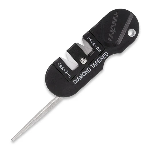 3.25″ overall. Lanyard hole. Coarse carbide and ceramic slots. Tapered diamond coated rod.