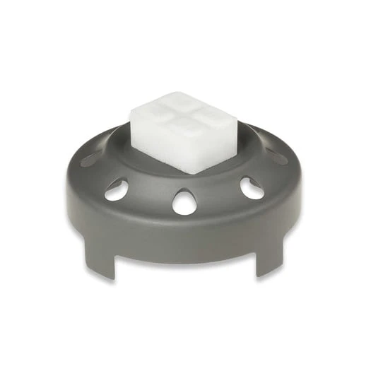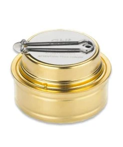 Lightweight, anodized aluminum construction. Includes 33 oz. pot with a volume indicator in liter/oz. increments on the side, and a 15 oz. pot/pan, which also serves as a lid. The set also includes a stand that supports the pots, and includes a base for Esbit solid fuel tablets and a solid brass alcohol burner. The alcohol burner allows variable temperature control and can hold the denatured alcohol during travel. All items can be stored inside the large pot and packed inside the included black nylon mesh storage bag. Dimensions-packed: 5.5″ x 5″.
