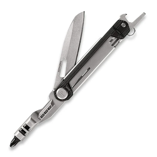 3.88″ closed. 6.75″ overall. Black aluminum handles. Tools include: Bottle opener l Scissors. 2.5″ locking blade. 2″ extension bit driver with 2-sided bit.