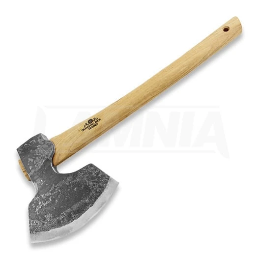 The pattern of the Broad Axe and the handle is based on old Swedish logging techniques for squaring logs and structural timber of all kinds. There is sufficient space between the “blade’s beard” and the handle for the user’s fingers. Beveled on two sides (double beveled). The direction of the handle is straight.