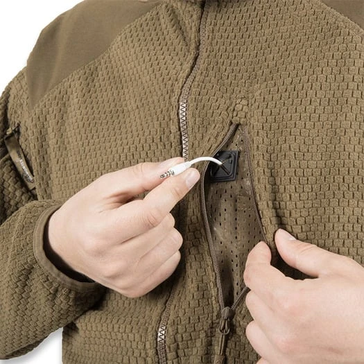 Alpha Hoodie is a lightweight fleece jacket, perfect as an additional layer or as a main layer. Reinforcements on elbows and shoulders prevent fleece from being damaged during use. The jacket has five zippered outer pockets: two bicep pockets, two classic hip pockets and one chest pocket. The chest pocket has also a small hole for cables. Drawstring in the bottom part as well as elastic binding at the cuffs and hood, makes this jacket fit perfectly, therefore providing the right protection against cold.
