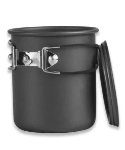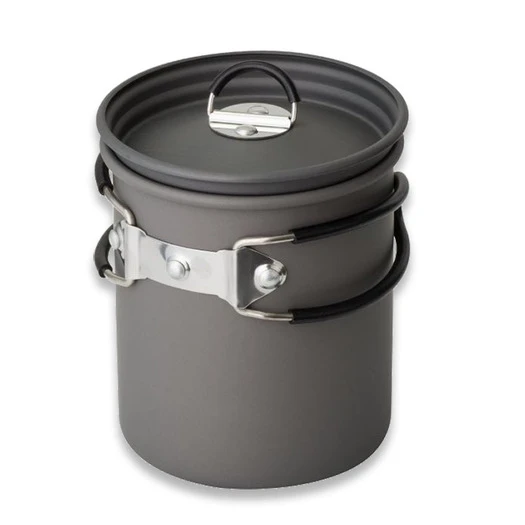 Large camp cup made of hard-anodized aluminum. May be heated on gas cookers or over fire. Has a lid, folding handle, wide enough to fit 1-liter Nalgene bottle.