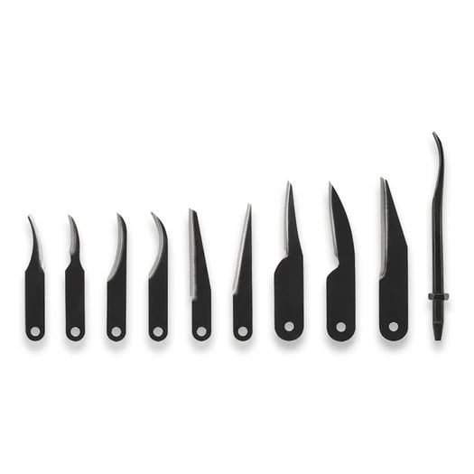 Carbon steel blade. Wood handle. Pack of 6 small detail blades: 8 mm x .762 mm; 20E x 24 mm radius ground on the outside curve; 21EX straight blade; 11 straight blade ground on the slanted edge; 10 25 mm radius ground on the inside curve; 8 51 mm radius ground on the inside curve; 22 51 mm radius ground on the inside curve; 1-LD64 mm x .1270 mm heavy duty blade; 1-LN89 mm x .1270 mm carving blade; 1-LS38 mm x .1270 mm carving blade, 1-LBG- #7 sweep gouge 8 mm cut. Handle with three way brass jaw chucking system. Magnetic carrying case. Boxed.