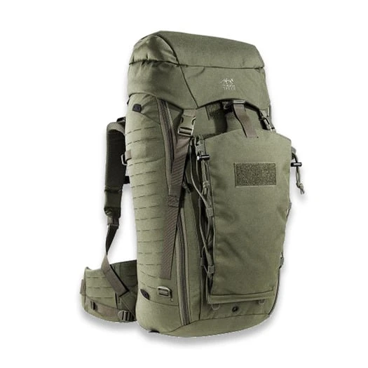 Modular, universal deployment backpack with removable lid. The front opening of this deployment backpack can be fully raised, and the lid can be height-adjusted or removed. The backpack has a lid compartment and has laser-cut MOLLE on the sides and on the front. It also has a removable folded pocket on the front. The interior has hook-and-loop panel for customizing the configuration. The removable hip belt can also be used separately as a Warrior Belt. Includes three attached accessory pouches and an attached weapon holster.