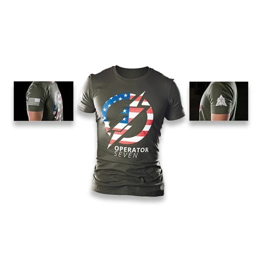 Operator 7 artwork on front. American Flag on right sleeve and TOPS logo on left sleeve. Cotton/polyester construction. Color: OD Green.