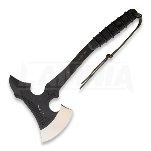Blade: Carbon Steel l Standard Edge; Handle: Black; Other Info: 210 mm black traction coated 1075 carbon steel axe head with 133 mm cutting edge and spike end. Full tang. Black linen micarta handles with green paracord lanyard. Black leather belt sheath with MOLLE loops.